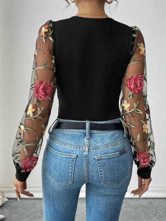 Perfee Flower Round Neck Long Sleeve Bodysuit