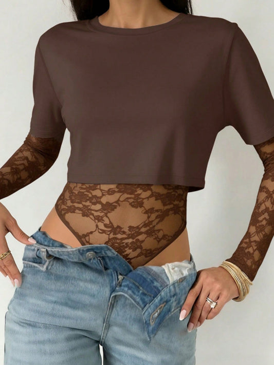 Lace Patchwork Round Neck Bodysuit