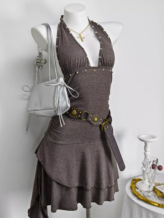 Studded Halter Neck Ruffle Hem Mini Dress