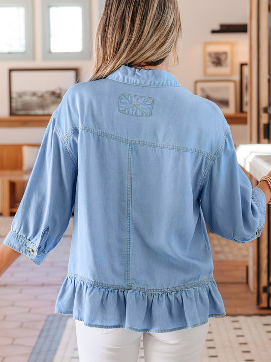 Half Sleeve Button Down Ruffled High Low Chambray Shirt